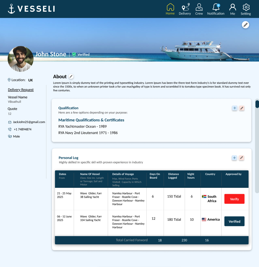 Imagine LinkedIn, but for the open sea. Our platform is a dedicated space for skippers and crew personnel to showcase their experience through comprehensive digital CVs. When you offer your services, your detailed information is delivered directly with a quote to the requester, ensuring transparency and efficiency.